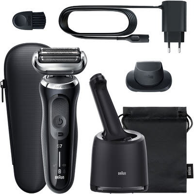 Braun Series 7 Elektrorasierer für Herren mit 360°-Anpassung für eine gründliche Rasur. Mit AutoSense-Technologie, die die Dichte Ihres Bartes erkennt und die Motorleistung anpasst, um mit jeder Rasur noch mehr Haare zu entfernen. Der Lithium-Ionen-Akku sorgt für eine Laufzeit von bis zu 3 Wochen und eine Schnellladung von 5 Minuten, die für eine Anwendung reicht. Dieser elektrische Rasierer für Herren ist 100% wasserdicht und für die Nass- und Trockenrasur geeignet. Kompatibel mit EasyClick-System für zusätzliche Funktionen Ihres Rasierers. Im Lieferumfang enthalten: 1x Series 7 Elektrorasierer für Herren 1x Präzisionstrimmer-Aufsatz 1x Reinigungsstation 1x Reise-Etui 1x Netzteil mit automatischer Anpassung an 100 V bis 240 V 1x Reinigungsbürste