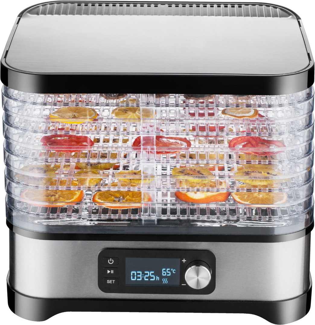 Digitales LCD Display. Programmierbarer Timer: 1-24 Std. Einstellbare Temperaturen 35-70°C. 5 stapelbare Ablagefächer. Optimierte Umlufttrocknung. Kunststoffgehäus. 400 Watt.