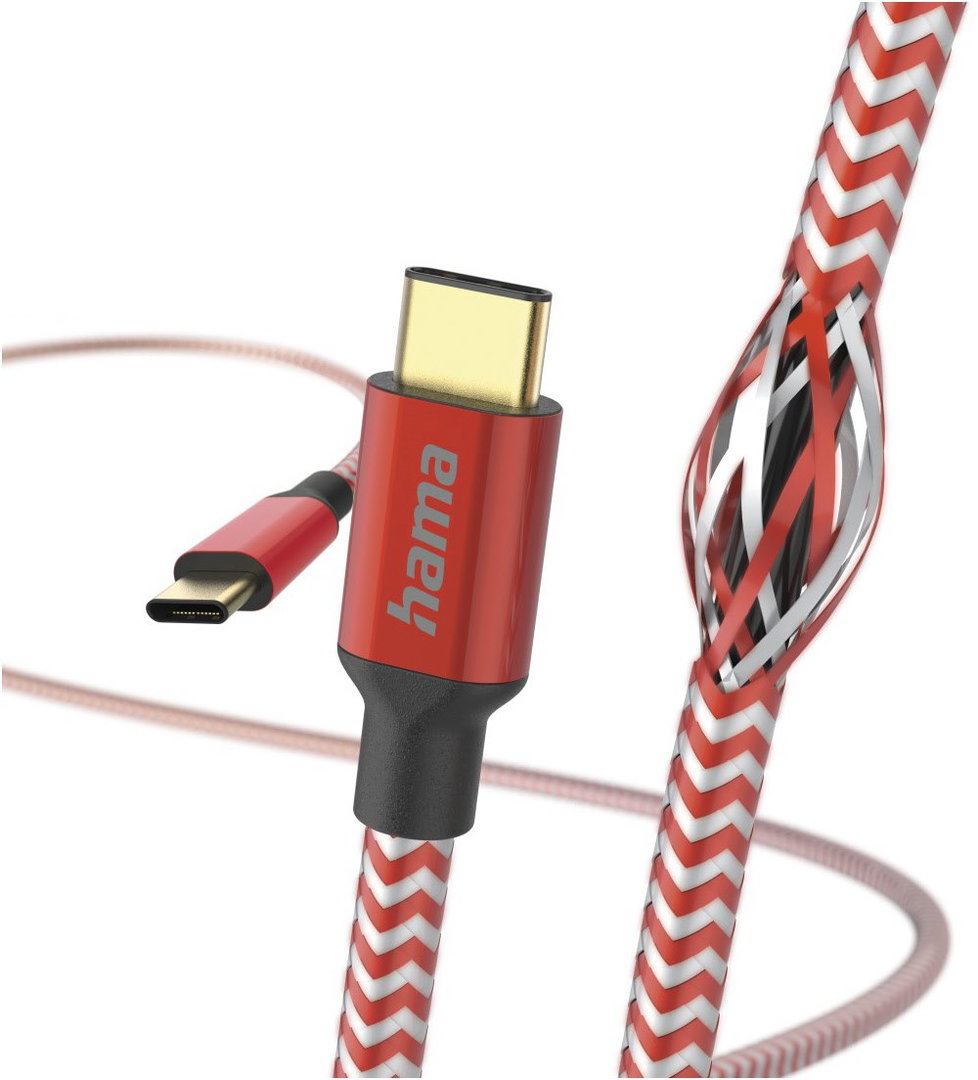 Ladekabel Reflective, USB-C - USB-C, 1,5 m, Nylon, Rot