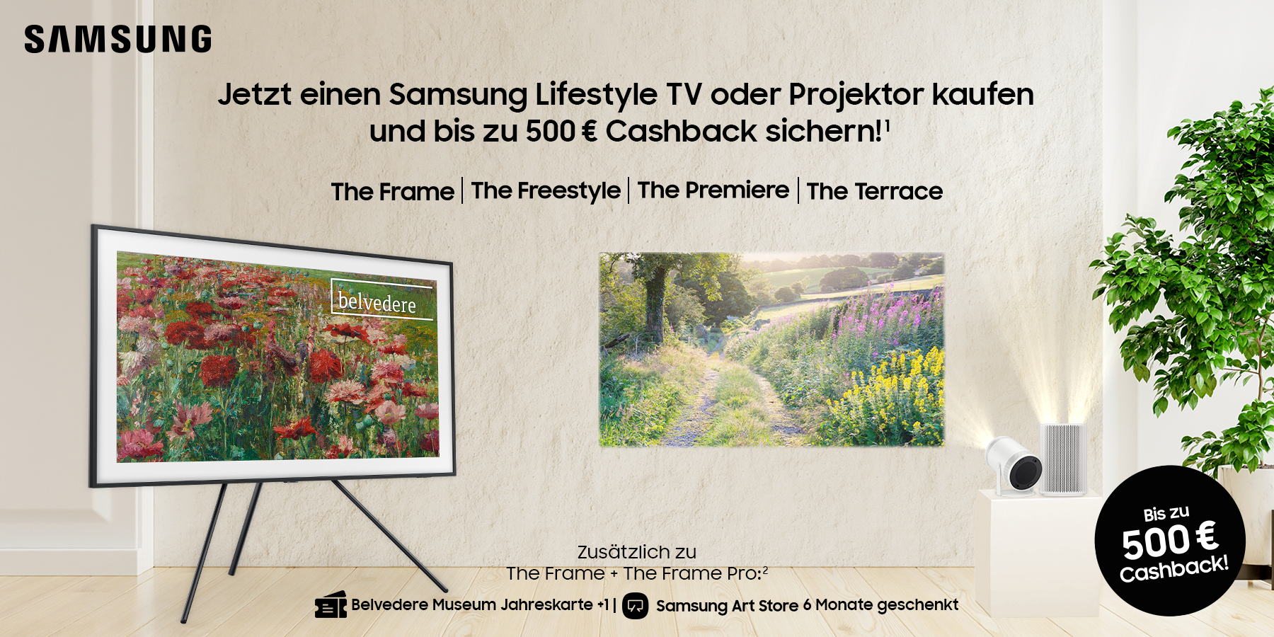 • Verwandle mithilfe des Art Modes deine Wohnung in eine virtuelle Kunstgalerie mit wechselnden Kunstwerken, wenn du gerade nicht Fernsehen guckst.
