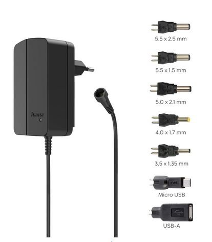 • Mit 7 Adapersteckern: 2 USB-Adapter: 1x Micro-USB-Stecker, 1x USB-A-Buchse; 5 DC-Stecker: 1,35 x 3,5 / 1,7 x 4,0 / 2,1 x 5,0 / 1,5 x 5,5 / 2,5 x 5,5 mm