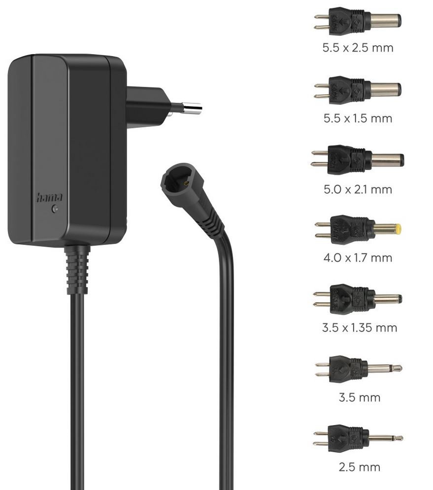 • Mit 7 Adapersteckern: 2 Klinkenstecker: 2,5 und 3,5 mm, 5 DC-Stecker: 1,35 x 3,5 / 1,7 x 4,0 / 2,1 x 5,0 / 1,5 x 5,5 / 2,5 x 5,5 mm